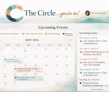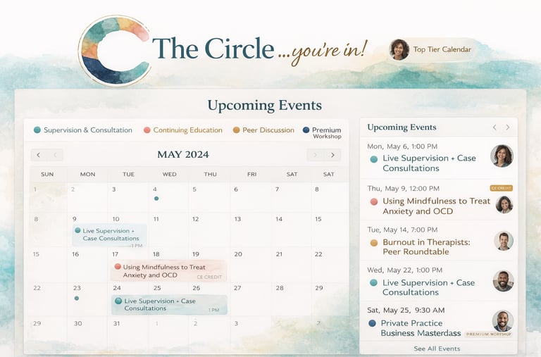 The Circle is for therapists who want a more thoughtful way to stay connected to the work. Not just to new ideas, though that matters. To the work itself. To the questions underneath it. To the parts of practice that get more interesting, and usually more complex, once school is over and you are the one in the room having to decide what to do next. It is a clinician-led community built for mental health professionals who want ongoing learning, case consultation, supplementary supervision where appropriate, and a professional space that feels steady, serious, and genuinely useful.